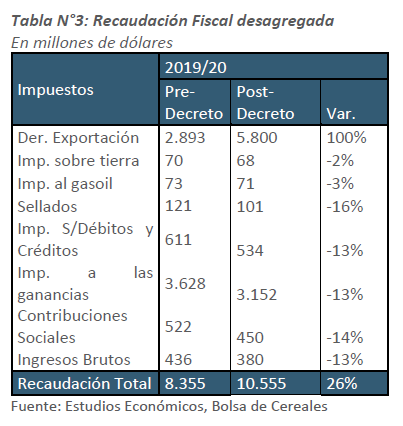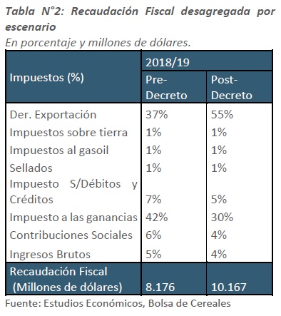Pese a que el valor agregado se encontraría negativamente afectado por el cambio regulatorio, la contribución del agro en materia fiscal se incrementaría sustantivamente. Para la campaña 2019/20, se recaudarían 2.201 millones de dólares extra, siendo los derechos de exportación el único impuesto que fundamenta este incremento.