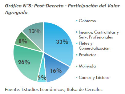 Por consiguiente, el incremento de la presión impositiva generaría que el Estado aumente su participación sobre el valor agregado total en 7 puntos porcentuales, quedándose con un 33% del Producto Bruto Agroindustrial, y posicionándose como el agente que mayor participación obtendría. En segundo puesto se ubicarían los productores, que luego de una disminución de 6 pp en su participación, debido a la disminución en el precio recibido generada por el nuevo impuesto, obtendrían un 26% del PBA.