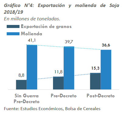 Sin guerra comercial y con el antiguo esquema de derechos de exportación, se habrían industrializado 41,1 millones de toneladas de soja; por encima de los 36,6 millones de toneladas que se estiman moler en el escenario Post-Decreto, un nivel históricamente bajo con una capacidad ociosa en torno al 36%. En el escenario Pre-Decreto, donde se asume el antiguo esquema de retenciones, pero la continuidad de la guerra comercial, la molienda llegaría a 39,7 millones de toneladas.