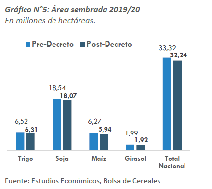 Como contrapartida, la medida tendrá impactos negativos sobre el área sembrada, la inversión por hectárea, la producción, la molienda y las exportaciones. La reducción del área sembrada en la campaña 2019/20 podría alcanzar el millón de hectáreas.