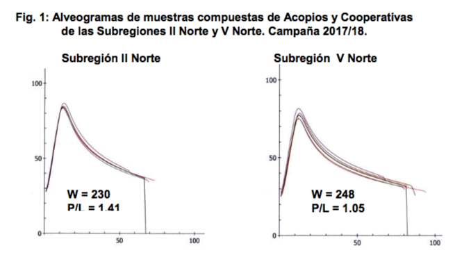 La fuerza panadera o W del alveograma (Fig.1), principal parámetro que define la calidad industrial de un trigo, fue inferior a la cosecha 2016/17, con un valor de 230 en la II N (270 cosecha anterior) y 248 en la V N (314 en la cosecha anterior). Valores semejantes se observaron en el Sur de Santa Fe (243), SE de Córdoba (220) y Norte de la Pcia. de Buenos Aires (270). La relación de equilibrio de tenacidad/extensibilidad (P/L) de las masas fue más tenaz que en la campaña anterior, influenciado por la baja proteína, sobre todo en la subregión II N con 1,41 y norte de la provincia de Buenos Aires con 1,74, valores superiores a 1 lo que hace que se tengan masas cortas que no favorece el volumen de pan. En la subregión V Norte se observaron masas más equilibradas con un P/L de 1,05 debido a que la proteína fue más alta.
