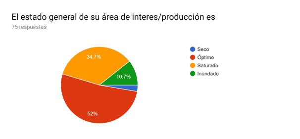 A nivel general se observó que el estado de la mitad de las áreas de producción/interés es óptimo, mientras que el otro 50% se divide entre saturado, inundado y en menor medida seco (sudoeste bonaerense).