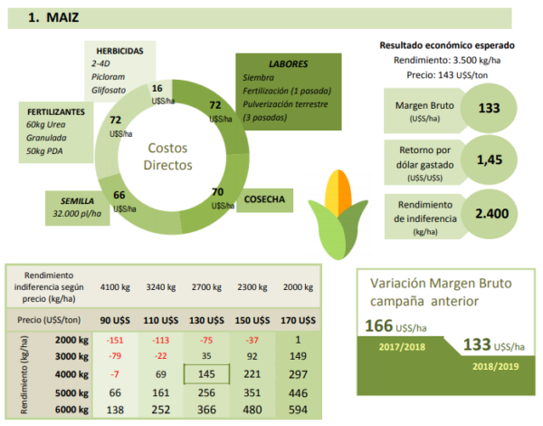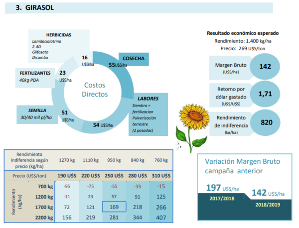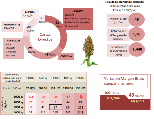 En el presente informe se evalúan los resultados económicos esperados para los cultivos de Maíz, Sorgo, Girasol y Soja en la campaña 2018/2019. Los rendimientos se establecieron en base al promedio histórico de la región, y se consideraron los valores de insumos y labores a octubre 2018.