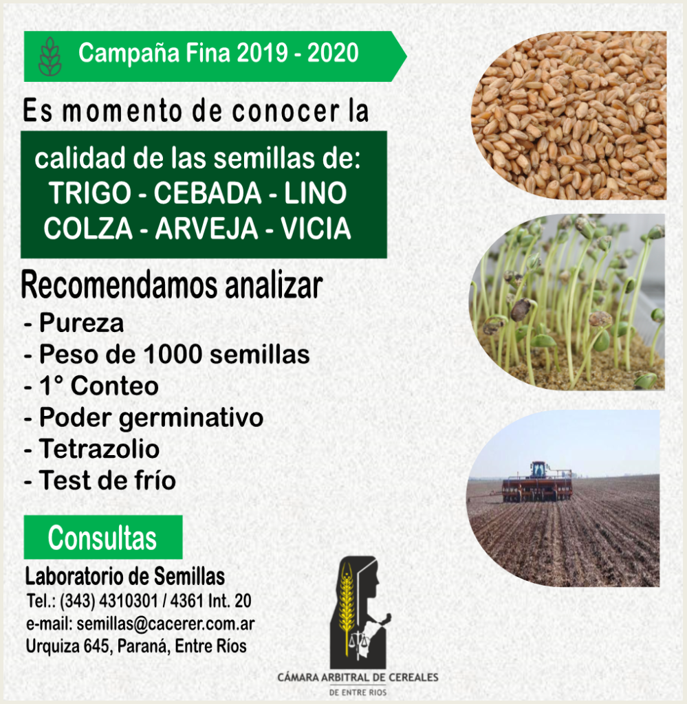 Cabe recordar que el Laboratorio de Semillas de la Cámara Arbitral de Cereales de Entre Ríos está habilitado por el Instituto Nacional de Semillas (INASE) y posee habilitación para emitir certificados de análisis de semillas válidos según las reglas de la International Seed Testing Association (ISTA); de este modo, los resultados obtenidos cuentan con un nivel de confiabilidad, garantía y seguridad.