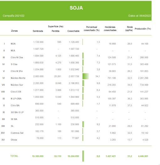 El clima favorable de la última semana impulsó el avance de cosecha sobre el centro del área agrícola. A la fecha, la recolección cubre el 8,8 % de la superficie, reportando un progreso intersemanal de 4,4 puntos porcentuales, con los mayores progresos relevados sobre ambos núcleos. El rendimiento medio nacional se ubica en 31,15 qq/Ha, tras cosechar más de 770 mHa durante los últimos siete días. Se registraron nuevas heladas durante la última semana, siendo el Norte de La Pampa-Oeste de Buenos Aires y el sur de ambas provincias las regiones más afectadas. Al momento de la presente publicación, 1,8 MHa, correspondientes a cuadros de soja de segunda, se encuentran definiendo rendimientos.