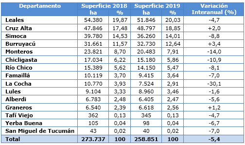 Tres departamentos que presentan una fuerte reducción con respecto al 2018 son La Cocha, que pasó de 10.770 (3,9%) a 7.524 (2,9%) en el 2019, con un 30% de disminución. En el mismo sentido, Monteros pasó de 23.821 (8,7%) a 20.483 (7,9) este año, es decir, 14% menos; y, Chicligasta redujo el 10,9% de la superficie, pasando de 17.034 (6,2%) a 15.180 (5,8%) en el 2019.