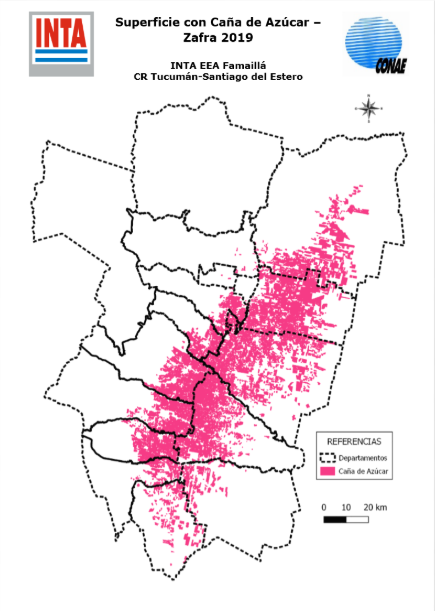 Continuando con las líneas de acción de años anteriores, la EEA Famaillá relevo la superficie ocupada por el cultivo este año a través del procesamiento de imágenes satelitales provistas por la Comisión Nacional de Actividades Espaciales de Argentina (CONAE). Los datos para realizar el cálculo se obtuvieron del satélite Landsat 8 (NASA). Los sensores satelitales adquirieron la información durante los meses de enero a abril del 2019. Se realizaron procesamientos parciales a nivel departamental de las distintas escenas satelitales para poder obtener la información buscada. Se trabajó con ADI (áreas de interés) enmascarándose el resto de los datos y se re proyectaron las imágenes a “Transverse Mercator”, datum “WGS 84” y clasificación no supervisada (ISODATA). Los programas utilizados para el procesamiento de las imágenes fueron ERDAS IMAGINE 9.x y QGIS (Open Free), obteniéndose capas vectoriales que serán incorporados en el portal web de INTA.