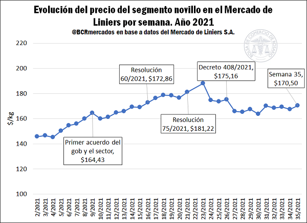 Por el lado de los precios internos, y más puntualmente, aquellos para los productores de ganado bovino, se vislumbra una dinámica alcista en los primeros meses del año, con mermas tras la aplicación de las medidas más restrictivas a partir de mayo para los precios del novillo en el Mercado de Liniers S.A. En este sentido, entre comienzos del año hasta la semana 35 (hasta sábado 28 de agosto) el valor se incrementó un 16,8% pasando de $ 145,9/kg vivo a $ 170,5/kg vivo. No obstante, se registra una caída del orden del 6% desde la aplicación de la Resolución 75/2021 (cierre de exportaciones en mayo) hasta finales de agosto.