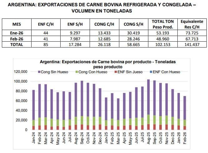 precedente; y también resultan (-16,3%) inferiores a los volúmenes embarcados en febrero de 2025. En los primeros dos meses del año 2026, las exportaciones de esta partida alcanzaron las 17,3 mil toneladas; un (-1,3%) por debajo de las 17,5 mil toneladas registradas entre enero y febrero de 2025. El ingreso de divisas por exportaciones de carne bovina refrigerada a lo largo de los primeros dos meses de 2026 resultó cercano a 213.3 millones de dólares; un (+29,7%) superior a los 164,5 millones que se habían facturado entre enero y febrero de 2025.