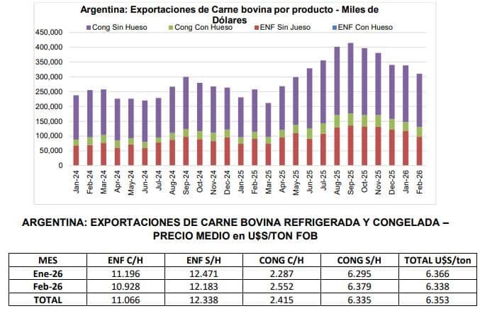 El precio promedio de exportación de carne bovina refrigerada y congelada resultó en el mes de febrero de 2026 de u$s 6.338 por tonelada. Este valor resulta un (-0,4%) inferior al obtenido en enero último; y un (+28,8%) más alto que el precio medio de febrero de 2025, que había sido de u$s 4.921 por tonelada.