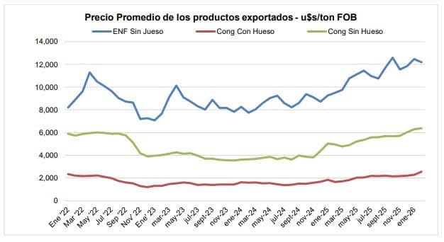 En febrero de 2026, se exportaron 8,0 mil toneladas de carne bovina refrigerada, por un valor de 97,3 millones de dólares. El precio promedio de las exportaciones de carne bovina