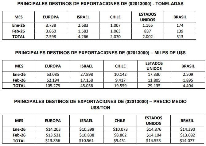 Los principales destinos de exportación para la carne refrigerada en febrero de 2026 resultaron los países europeos (3,9 mil toneladas / 52,2 millones de u$s), Israel (1,6 mil ton / 17,2 millones de u$s), y Chile (1,1 mil toneladas / 9,4 millones de dólares).