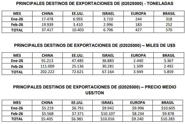 Los principales destinos de exportación para la carne congelada sin hueso en febrero de 2026 resultaron la República Popular China (19,9 mil toneladas / 111,0 millones de u$s), Estados Unidos (3,4 mil toneladas / 25,1 millones de dólares), e Israel (3,0 mil toneladas / 30,3 millones de dólares).