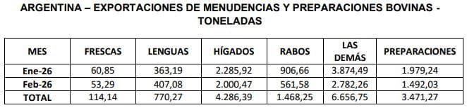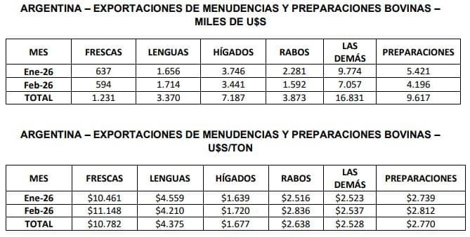 febrero de 2026 totalizaron un volumen de 7,3 mil toneladas, por un valor de 18,6 millones de dólares. El precio medio de exportación de estos productos se ubicó levemente por debajo de los u$s 2.550 por tonelada, con picos superiores a los u$s 4.200 para el producto lenguas bovinas. En los primeros dos meses del año 2026, las ventas de menudencias y preparaciones bovinas treparon a un volumen de 16,8 mil toneladas, por un valor de 42,1 millones de dólares”, concluyó Ravettino.