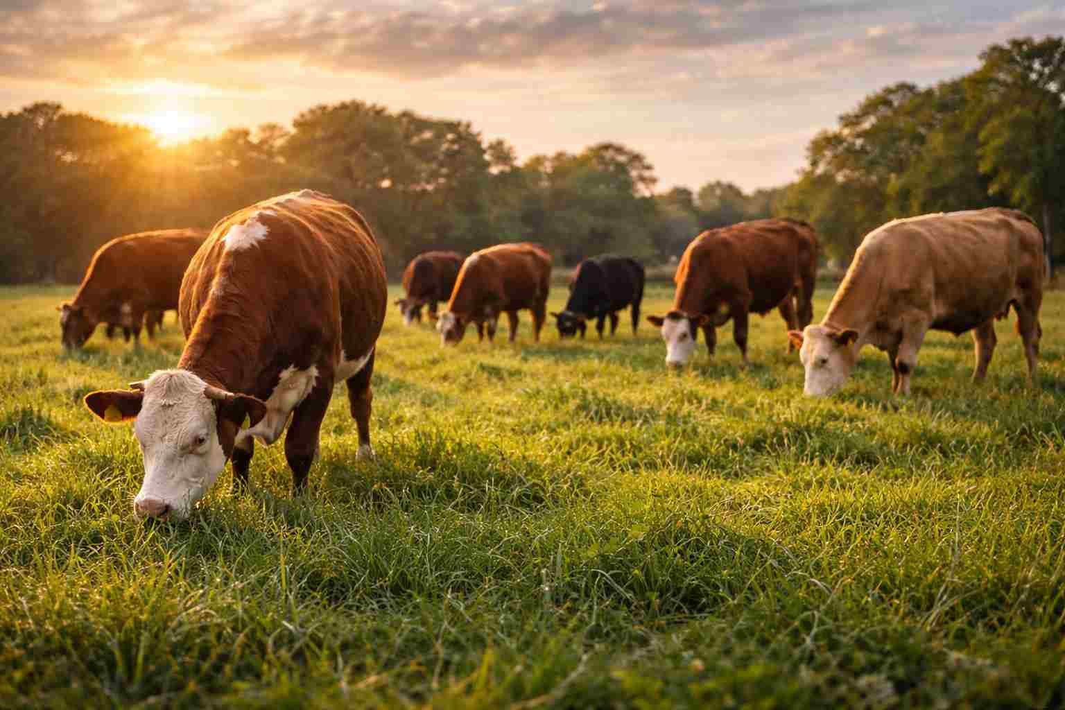 Vacas pastando en un campo argentino durante el atardecer, representando sistemas ganaderos pastoriles y producción de carne a pasto