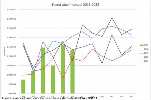 En junio se enviaron a frigoríficos 1,13 millones de cabezas, 2% debajo de mayo y 4% más interanual. Ajustadas por día hábil, las comparaciones resultan en aumento de 3 y de 10%, en ese orden. En el primer semestre, se ve un incremento del 2% en la faena.