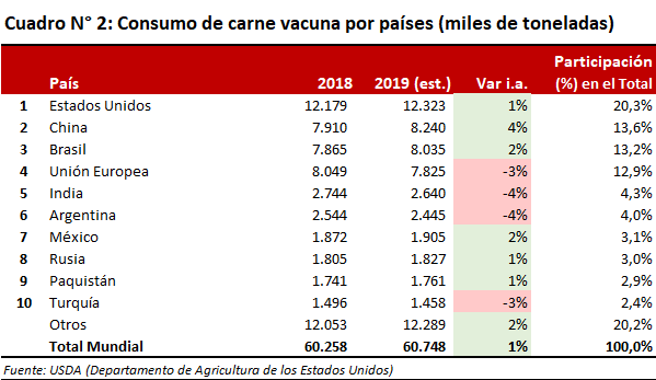 2) En consumo global de carne vacuna también aumentaría un 1% en el año 2019, a 60,7 Mt, traccionado fuertemente por China y destacándose también los aumentos en Estados Unidos y Brasil.
