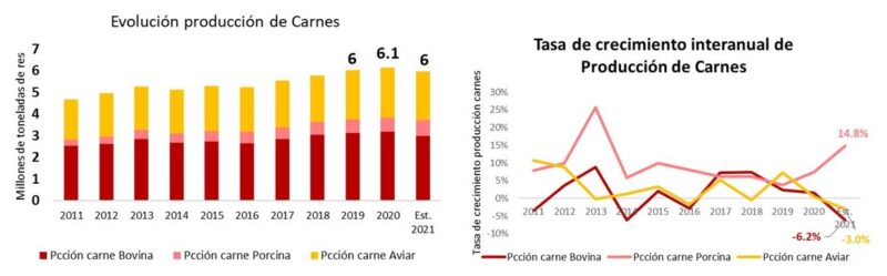 - Evolución de producción local de carnes: en el primer gráfico vemos un crecimiento sostenido de producción de carnes, con aumento del protagonismo de carne aviar y porcina, sobre la carne bovina. Los últimos tres años se alcanzó a seis millones de toneladas de carne, sumando la producción anual de carnes. En el segundo gráfico se observa la tasa interanual de crecimiento de producción de las tres carnes por separado. Vemos que la carne porcina es la que se ha sostenido en tasas positivas, con una proyección de crecimiento del 15% para este año. La producción aviar disminuye su producción por segundo año consecutivo y la bovina disminuye por tercer año consecutivo.