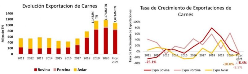 - Evolución de Exportación de Carnes: las exportaciones han crecido en volumen los últimos tres años, superando en suma el millón de toneladas, con especial protagonismo de la carne bovina. Es interesante ver la tasa de crecimiento de las exportaciones, donde 2018 fue un año de salto en el volumen exportado de carne bovina, 2019 para carne aviar y 2020 para carne porcina. Sin embargo, se observa que la tasa de crecimiento no puede sostenerse en el tiempo, con una fuerte baja en lo proyectado para fin de este año.