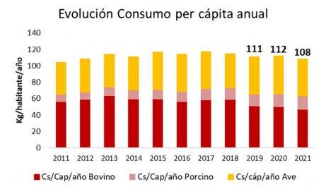 - Evolución de consumo por habitante por año: por último, la evolución de consumo local de carnes por habitante por año, se ha sostenido por encima de 100 kilos, con máximos de 217 kilos en 2015 y 2017 y bajando a 108 en la proyección para este año.