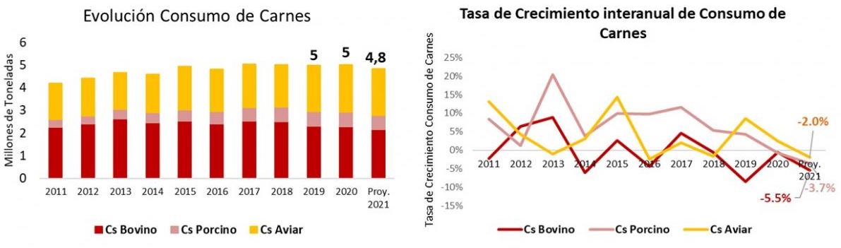 - Evolución de Consumo de Carnes: en millones de toneladas se ha sostenido un consumo anual de 5 millones de toneladas por año sumando el consumo de las tres carnes. Vemos este año una disminución de 200 mil toneladas menos de consumo, según la proyección 2021. En cuanto a la tasa de crecimiento del consumo anual de carnes, los últimos dos años han sido decrecientes para el consumo aviar y porcino, y este año se proyecta decrecimiento en el consumo de carne de vaca.