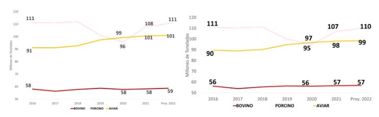 El informe de carnes del USDA de abril, proyecta un aumento en la producción mundial de carne porcina y bovina para este año, respecto al año pasado, 3 y 1 millón de toneladas respectivamente. No obstante, no presenta cambios en la producción mundial aviar. En cuanto al consumo mundial de carnes, pronostica un aumento de 3 millones de toneladas en el consumo mundial de carne porcina, 1 millón de toneladas en el consumo de carne aviar, y sin cambios significativos en el consumo de carne bovina. Por último, en cuanto a las exportaciones de carnes, comparando con el 2021, mientras las exportaciones de carne bovina aumentan 400 mil toneladas, las de carne aviar aumentan 100 mil toneladas. Las de carne porcina disminuyen 500 mil toneladas, siendo China quien reduce drásticamente sus importaciones de carne porcina este año, en 830 mil toneladas. Esto es coherente con la recuperación productiva del primer productor y consumidor mundial de carne porcina, China, que en este 2022 produciría 3,5 millones de toneladas más de carne porcina respecto a 2021, acercándose a los niveles productivos del 2018, previo al impacto de la peste porcina africana.