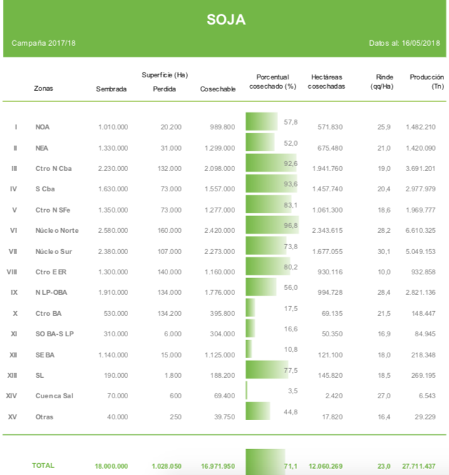 La cosecha avanzó 4,4 puntos en los últimos siete días y se estima que un 71,1 % del área apta ya fue recolectada, sosteniendo un rinde medio de 23qq/ha. El actual avance nacional en la recolección se encuentra retrasado en -3,6 puntos comparado al ciclo previo, un importante retraso generado por el temporal si tenemos en cuenta que hasta hace cuatro semanas atrás se registraba un adelanto interanual superior a los 20 puntos porcentuales.