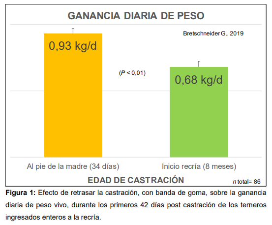 Se compararon dos edades de castración. La castración temprana, referida a los terneros castrados al pie de la madre, a los 34 días de vida y la castración tardía, realizada a los 8 meses de edad, al comienzo de la recría, mediante una banda de goma aplicada sobre la base del escroto. Los terneros castrados al píe de la madre (n = 43; grupo control) y los castrados posteriormente, al comienzo de la recría (n = 46) – con un peso promedio de 277 kg – se transportaron a una estación experimental para comenzar el programa de recría a corral, con dos entregas diarias de una ración totalmente mezclada (TMR; por sus siglas en inglés). En promedio, los terneros castrados al pie de la madre ganaron diariamente 37 % (0,25 kg/día) más que los terneros castrados más tarde, una vez comenzada la recría, durante los primeros 42 días de alimentación a corral (Figura 1). En total, los terneros castrados en los primeros días de vida ganaron 10,5 kg más que la contraparte castrada al comienzo de la recría. Para destacar, la magnitud de la disminución de la GDP registrada en el lote de terneros castrados a los 8 meses de edad, resultó similar a la merma de GDP estimada mediante la ecuación de regresión publicada en el primer meta-análisis que evaluó el efecto de la edad y método de castración sobre la respuesta productiva y el estrés de los terneros (Bretschneider, G., 2005, Livest. Prod. Sci 97: 89 -100; https://www.sciencedirect.com/science/article/pii/S0301622605001429 ).