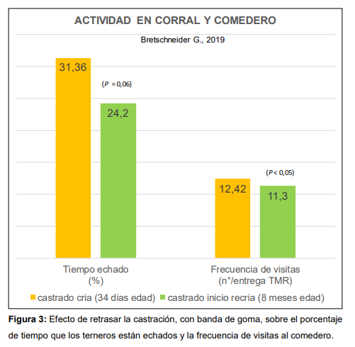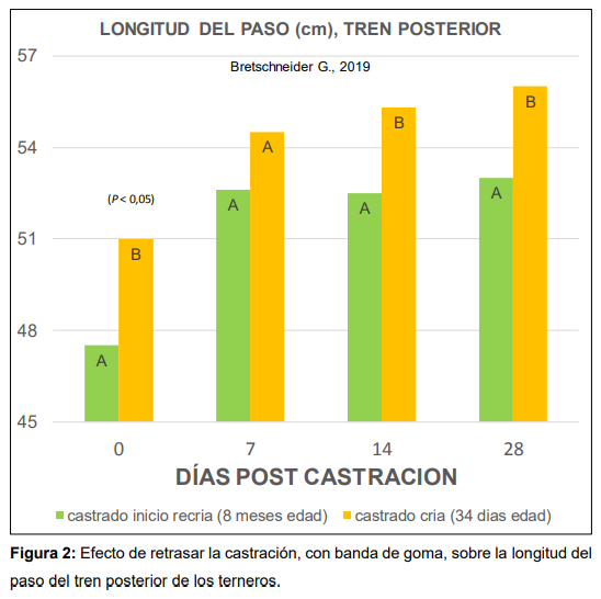 A partir de un meta-análisis – estudio que combina los resultados de diferentes ensayos – Bretschneider, G. determinó que, a mayor edad de castración de los terneros, menor es su respuesta, en términos de ganancia de peso, a la alimentación. Además, sugirió que el dolor asociado a la inflamación de la herida, y seguramente al tamaño de la misma, debería jugar un rol importante en la magnitud de la respuesta productiva expresada por los terneros. En una investigación realizada en Alberta, Canadá, se evaluó el efecto de retrasar la castración sobre la ganancia diaria de peso (GDP) y la respuesta al dolor de los terneros.