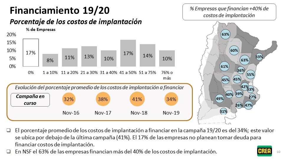 La inestabilidad macroeconómica registrada durante los últimos meses del año limita las opciones de financiamiento, razón por la cual la proporción del costo promedio por financiar, según lo indicado por los encuestados, se ubica en un 34% en el presente ciclo, una cifra inferior al 41% y 38% registrado en noviembre de 2018 y 2017 respectivamente. A su vez, los buenos resultados de la campaña 2018/19 contribuyeron a la posibilidad de adelantar el pago de algunos insumos, una decisión tomada por casi 1 de cada 2 empresarios CREA en el contexto reciente.