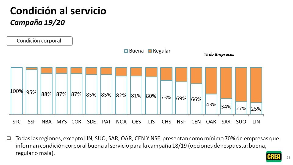El factor climático adverso también “pasó factura” a las empresas fabricantes de terneros/ras, dado que la mayor parte de los criadores localizados en las regiones CREA Litoral Norte, Sudoeste, Semiárida y Oeste Arenoso –donde se concentra buena parte del rodeo de cría argentino– informaron que la condición corporal de las vacas es regular.