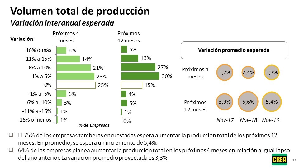 Como la mayor parte de las cuencas lecheras se ubican en zonas que no fueron afectadas por la sequía, el 75% de las empresas tamberas CREA señaló que espera aumentar un promedio de 5,4% la producción total de leche durante 2020. Además, el 64% de los tamberos indicó que planea aumentar la cantidad de vacas en ordeñe en los próximos cuatro meses –en comparación a igual período de 2018– en una proporción del 4,2%.