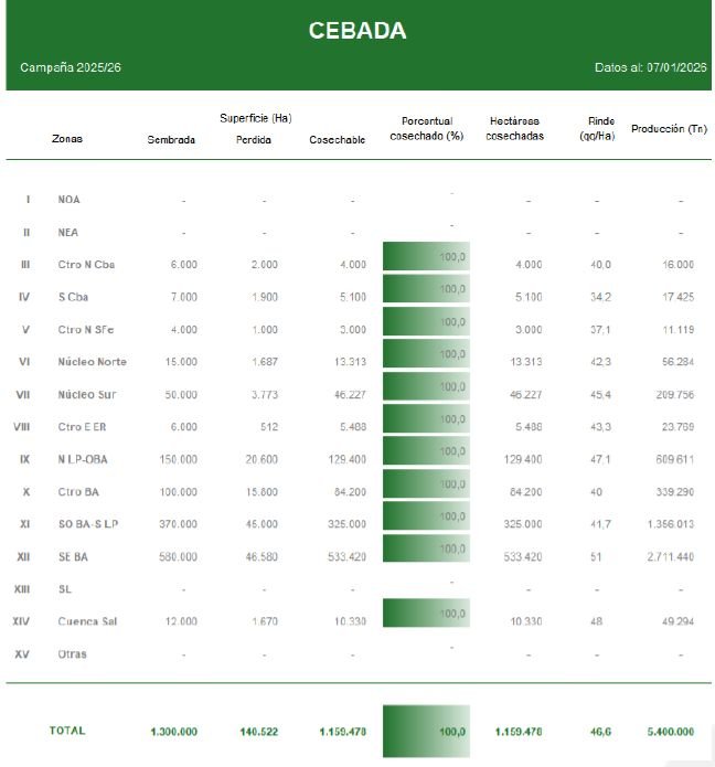 La campaña de cebada 2025/26 cerró con números que reescriben el balance del cultivo en Argentina. Con una cosecha prácticamente concluida y rendimientos muy por encima de los registros habituales, el ciclo se consolida como el más exitoso de los últimos diez años tanto en productividad como en volumen total.