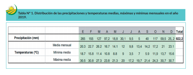 Condiciones ambientales durante el ciclo del Cultivo 2019. La siembra del ensayo se retrasó por las reiteradas lluvias del mes de junio, que sumadas a las ocurridas durante el verano, se encontraba con muy buenas condiciones de humedad inicial. Desde enero a mayo llovieron 660 mm, y desde junio a noviembre 261 mm más (Tabla N° 1). Es de destacar que durante el mes de septiembre la temperatura mínima (5,9 °C) fue menor en 2,8 °C respecto a la serie histórica de 30 años (8,7 °C).