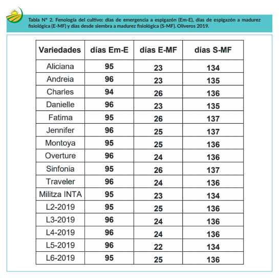 En la Tabla N° 2, se presenta la fenología del cultivo, utilizando la escala de Zadoks et al., 1974. En la misma se puede observar que los días desde emergencia a espigazón fueron similares entre las distintas variedades de cebada, variando entre 94 y 96 días. En tanto que para la etapa desde espigazón a madurez siológica, las diferencias fueron de alrededor de 3 días como máximo. En general, el ciclo total del cultivo desde siembra a madurez siológica fue de 134 a 137 días.