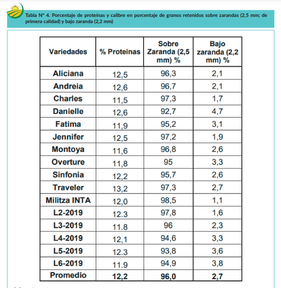 El porcentaje de proteínas en promedio fue de 12, 2%, con lo cual estaría dentro del valor de tolerancia de recibo permitida por la norma de calidad para la comercialización. En el calibre de los granos hubo diferencias entre los genotipos, el promedio general del ensayo fue de 96 % de primera calidad (Tabla N° 4), destacándose Militza INTA con 98,5 % y Traveler, Jennifer, Charles y L2-2019 con valores por encima del 97 % de primera calidad.