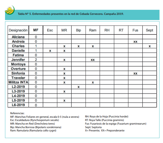 Se puede observar que las enfermedades presentes fueron Escaldadura, Mancha en Red, Mancha Borrosa o bipolaris, Ramularia, Septoria en forma leve. De las enfermedades foliares preponderantes, se vieron mayores diferencias en Fusariosis de la espiga que afecto a Andreia y Sinfonia, y por otro lado Ramularia que afectó mayormente a Jennifer (Tabla N° 5).