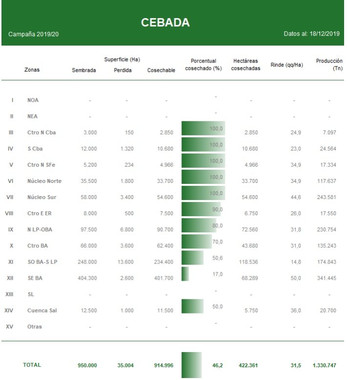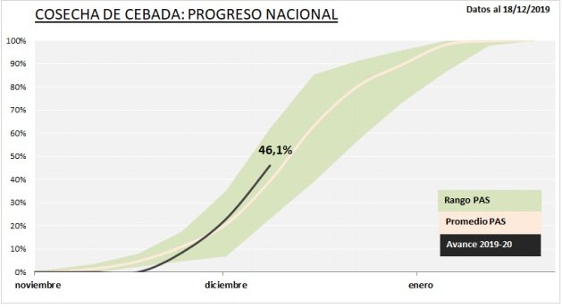 Durante los últimos quince días la cosecha de cebada avanzó en las regiones del centro y sur del área agrícola. A la fecha se recolecto el 46,2% de la superficie apta, representando 422 mHa en números absolutos, con un rendimiento medio nacional de 31,5 qq/Ha. Bajo este escenario, la proyección de producción de mantiene en 3,2 MTn.