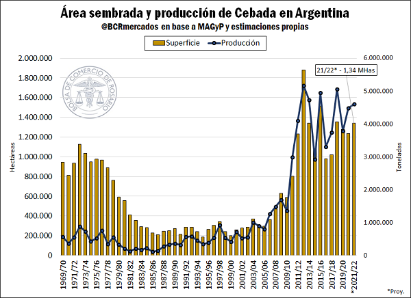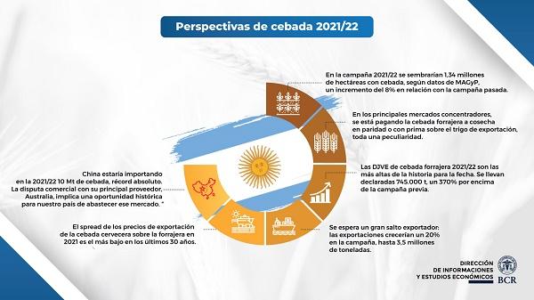 • En la campaña 2021/22 se sembrarían 1,34 millones de hectáreas con cebada, según datos de MAGyP, un incremento del 8% en relación con la campaña pasada.