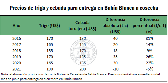 El mercado local está mostrando un claro incentivo a incrementar el área sembrada con cebada, pagando primas por encima del precio del trigo en los principales mercados concentradores, lo que no suele ser la norma. Tomando las cotizaciones estimativas de la Bolsa de Cereales de Bahía Blanca del día 15 de junio, el precio de la Cebada forrajera para entrega en ese destino en el mes de diciembre se negociaba a US$ 200/t, US$ 10/t por encima del trigo cámara. Si nos remontamos a la misma fecha de 2020, el precio de la cebada a cosecha se negociaba con un descuento de US$ 30/t por debajo del precio del trigo, en US$ 135/t.