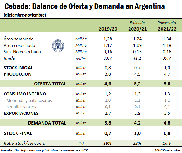En lo que respecta a la hoja de balance de oferta y demanda para nuestro país para la nueva campaña, se proyecta una mayor producción y un mayor stock inicial. Aun así, el importante incremento de las exportaciones que se espera (+20%) junto con mayor demanda para la industria cervecera, repercutirían en una caída en los stocks finales para la campaña 2021/22 y un menor ratio stock consumo en relación con la campaña previa. Las exportaciones alcanzarían los 3,5 millones de toneladas, de cumplirse, el mayor volumen exportado desde la campaña 2012/13.
