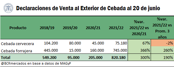 Argentina lleva a la fecha el mayor volumen de cebada forrajera comprometido para esta altura del año en su historia. Actualmente, el sector exportador lleva declaradas en ventas al exterior 745.000 toneladas de cebada forrajera para entregas a partir de diciembre, un 370% por encima de lo que se llevaba comprometido a misma altura del año pasado (160.000 t).
