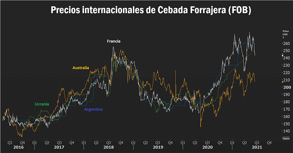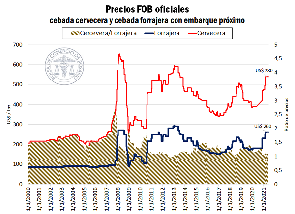 • El spread de los precios de exportación de la cebada cervecera sobre la forrajera en 2021 es el más bajo en los últimos 30 años.