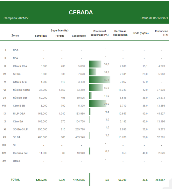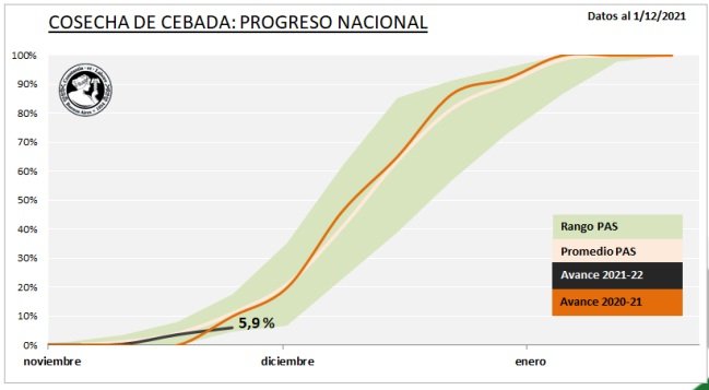 Durante los últimos quince días, la cosecha se cebada continuó su avance registrando los mayores progresos intersemanales sobre el centro del área agrícola. Los rendimientos semanales variaron con mínimos de 22 qq/Ha y máximos de 42 qq/Ha sobre el Centro-Norte de Córdoba y el Núcleo Norte.
