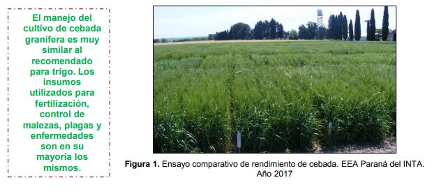 La cebada para producción de granos es un cultivo que en los últimos 10 años viene ganando un lugar como alternativa al cultivo de trigo, permitiendo incrementar y diversificar la producción invernal en la zona pampeana norte (Córdoba, Santa Fe y Entre Ríos), donde el ambiente se caracteriza principalmente por mayores temperaturas y lluvias (especialmente Santa Fe y Entre Ríos) respecto a su zona núcleo de producción (Buenos Aires y La Pampa). Los granos de cebada se pueden destinar a la industria para la elaboración de malta como insumo de las cervecerías. Este uso exige que cumpla con las siguientes exigencias de calidad: contenido de proteína entre 9,5 y 13 % y calibre 1ª calidad (sobre zaranda de 2,5 mm), mínimo de 85 %, entre otros. El cumplimiento de estas exigencias permitirá lograr un precio diferencial. Otra opción es su utilización y/o comercialización como grano forrajero. La consolidación de la exportación de grano forrajero, especialmente por la firme demanda de países árabes, permitió que desde el año 2010 el mercado forrajero se mantenga con cierta estabilidad. Los ensayos comparativos que se repiten anualmente son una buena herramienta para detectar la respuesta que presenta cada cultivar ante las condiciones ambientales de la campaña e identificar aquellas que logran producciones superiores.