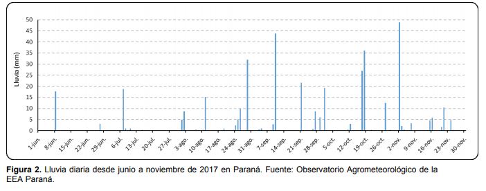 El perfil de suelo a la siembra se encontraba bien cargado por las lluvias ocurridas en los meses previos a la siembra. Durante el ciclo del cultivo (junio a noviembre) las lluvias sumaron 388 mm con una alta frecuencia de las mismas (Fig. 2), principalmente a partir de agosto, lo que favoreció la ocurrencia de condiciones ambientales predisponentes para las enfermedades fúngicas.