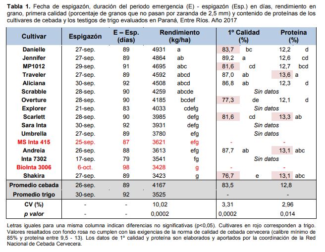 Con la finalidad de evaluar y comparar la adaptación y el comportamiento productivo de los cultivares comerciales disponibles, se evaluaron en 2017 en la EEA Paraná 14 cultivares comerciales de cebada cervecera, se testearon 13 líneas (posiblemente futuras variedades comerciales) de diferentes programas de mejoramiento y 2 variedades de trigo a modo de referencias conocidas para comparación. La siembra se realizó el 21 de junio en un suelo molisol, en directa sobre rastrojo de soja. Se realizó un manejo tradicional de control de malezas con glifosato, dicamba y metsulfurón metil y se fertilizó para evitar limitantes nutricionales con 200 kg/ha de fosfato diamónico al voleo previo a la siembra y 200 kg/ha de urea hacia fin de macollaje. El control sanitario se realizó con curasemilla Sistiva, que combina la acción fungicida de una carboxamida con la de un triazol y en postemergencia con Orquesta Ultra, triple mezcla de fungicidas en la que se combina una estrobilurina, un triazol y una carboxamida. Se evaluó la producción de grano en todos los cultivares y líneas experimentales y la calidad comercial cervecera (calibre y proteína) en 9 cultivares de cebada.