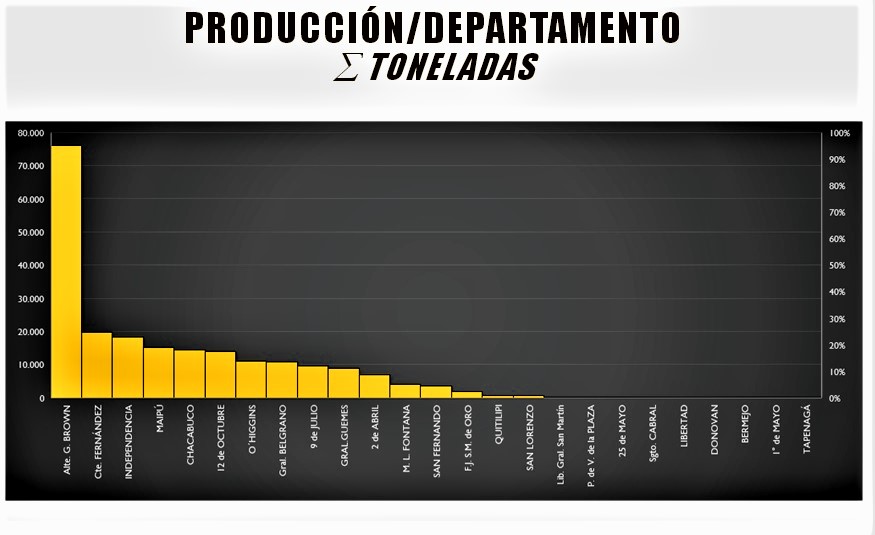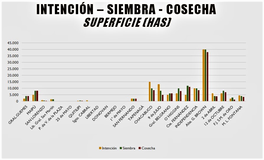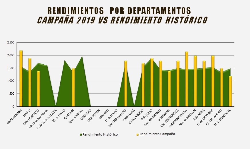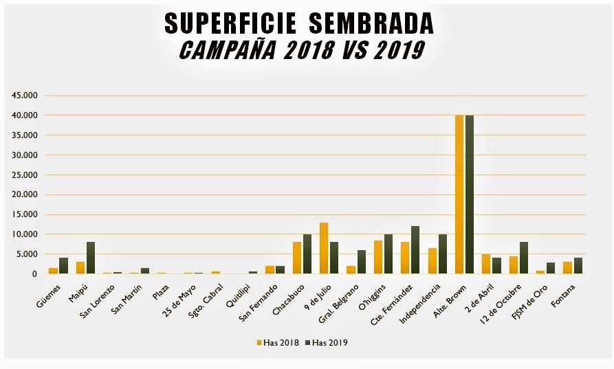 ALMIRANTE BROWN: Intención de siembra 40.000 hectáreas. Siembra 40.000 hectáreas. Cosecha 38.000 hectáreas. Rinde Campaña 2018/2019 2.100 kilos por hectárea. Promedio/hectárea últimos 5 ciclos 1.470 kilos.
