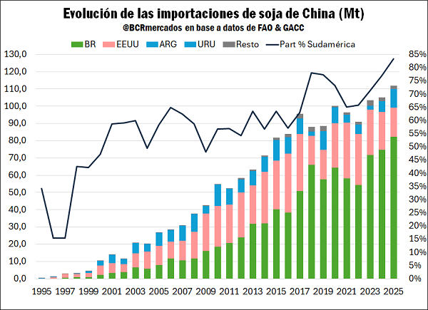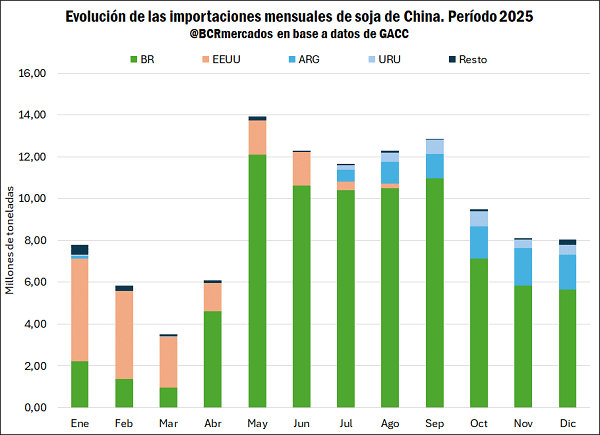 El gran cambio de 2025 fue el origen. Brasil volvió a liderar con 82 Mt, quintuplicando los envíos estadounidenses. Argentina aportó casi 8 Mt, su mejor registro en seis años, y Uruguay sumó 3,1 Mt, también en máximos históricos. El resultado: Sudamérica se consolida como socio estratégico de la seguridad alimentaria china y el Mercosur refuerza su influencia comercial.
