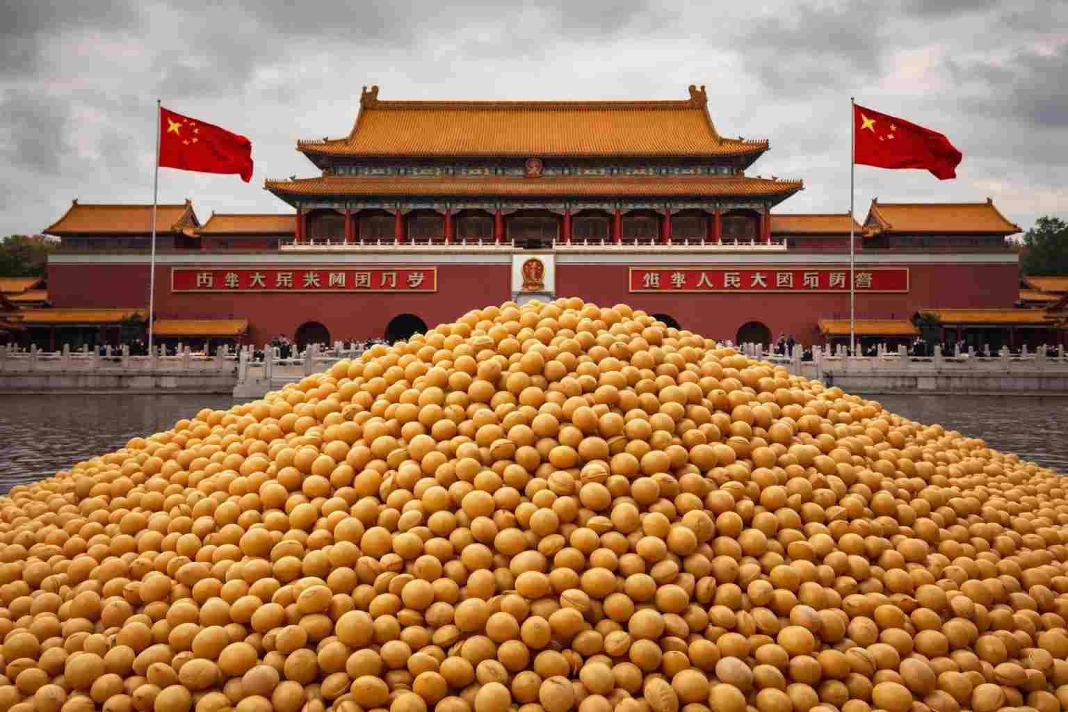 Montículo de soja en primer plano frente a la Ciudad Prohibida en China, simbolizando el comercio internacional de granos.